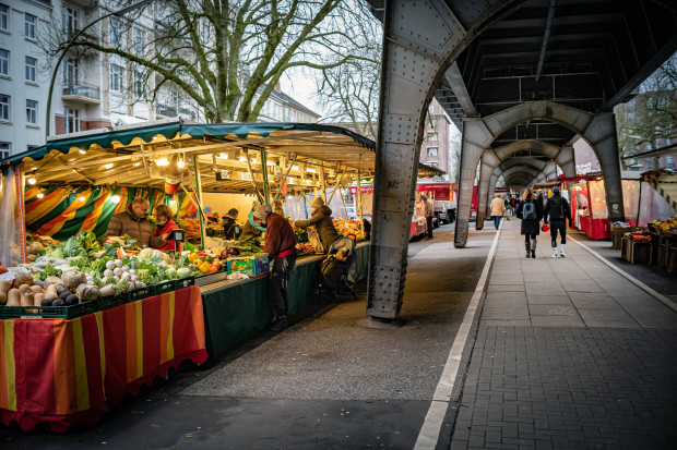 Es gibt Feinschmecker, die halten den Hamburger Isemarkt für einen der schönsten Märkte der Welt. Ich möchte mich da nicht zu weit aus dem Fenster lehnen. Sicher dürfte sein, dass der Isemarkt der größte und vielfältigste der Republik ist. Und der am originellsten gelegene. Mit seinen rund 200 Händlern schlängelt sich der Isemarkt etwa 600 Meter unter einer Hochbahnbrücke zwischen den U-Bahnstationen Hoheluftbrücke und Eppendorfer Baum entlang, was ihn – nun aber unzweifelhaft – zum größten überdachten Wochenmarkt Deutschlands macht.
