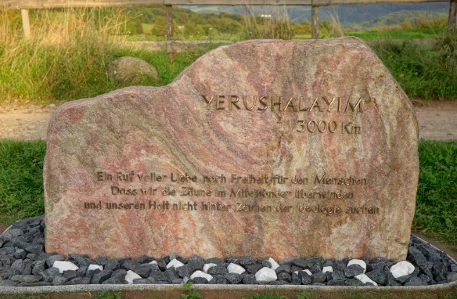 „Yerushalayim (…), dass wir die Zäune im Miteinander überwinden und unseren Halt nicht hinter Zäunen der Ideologie suchen” – lautet die Inschrift auf dem Jerusalem Erinnerungsstein. Es sei ein Ruf der Sehnsucht nach Frieden und einem von Respekt geprägten Umgang der Menschen miteinander. Hiermit wird das Thema „gesunde Grenzen” angesprochen.