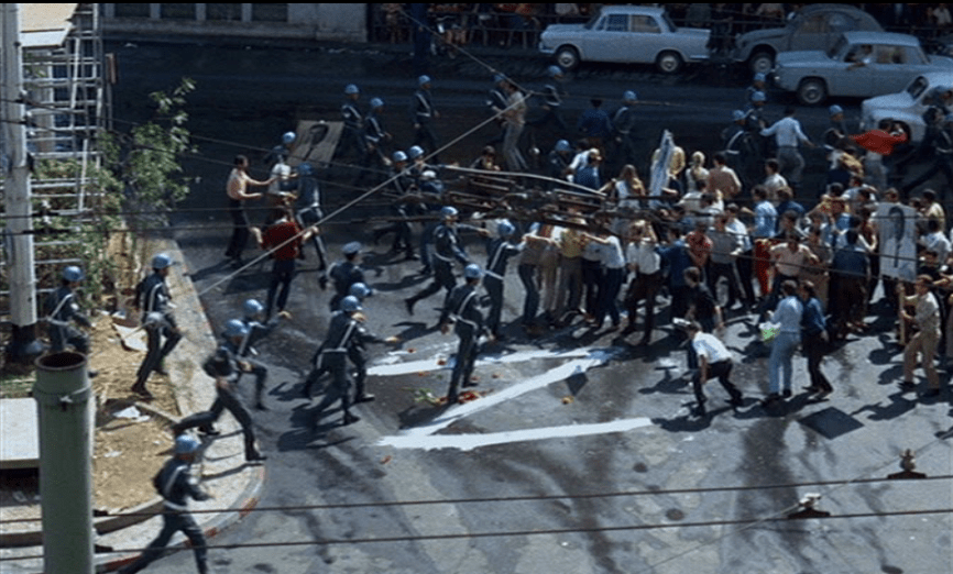 Rückkehr der Vergangenheit: Griechisches Militär geht gegen Demonstranten vor. Die soziale Katastrophe nach Staatsbankrott könnte die Gewalt nach Griechenland zurückbringen. Hier eine Szene aus dem politischen Film-Klassiker „Z“ von Costa Gavras vor dem Hintergrund der griechischen Militärdiktatur.“ Z“ wurde erstmals am 26. Februar 1969 in Frankreich aufgeführt.