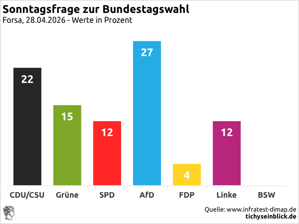 Wenn die Folgen der Regierungspolitik der Union Deutschland in voller Härte treffen werden, wird die INSA-Umfrage vom 28. April noch als gutes Ergebnis gelten, an das man sehnsüchtig zurückdenkt. Laut Ergebnissen der letzten Sonntagsfrage von INSA käme die AfD auf 28 Prozent der Stimmen, die Union nur noch auf 23,5 Prozent. Damit nähert sich die CDU von Friedrich Merz der 20-Prozent-Grenze und Friedrich Merz folgt Lars Klingbeil, dessen SPD bei 14 Prozent liegt, während die Grünen bei 12,5 Prozent und die Linken bei 11 Prozent stehen. Doch die Vereinigte Linke (SPD, Grüne, Linke) verharrt zusammen – noch – bei ca. 37 Prozent, wobei auch die Potentialanalyse zeigt, dass auch ihre Potentiale schwinden. Nur der AfD gelingt es, ihr Potential zu erweitern, das derzeit bei 35 Prozent der Stimmen liegt.