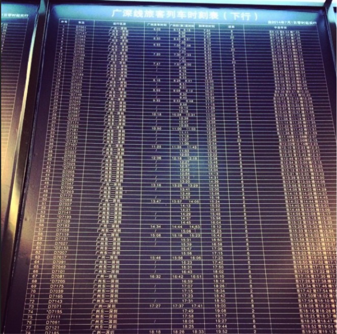Natürlich muss China eine ganz andere Masse an Menschen bewegen, als das doch eher kleine Deutschland – dennoch ist allein die Frequenz, mit der die Hauptknotenpunkte bedient werden, atemberaubend. Als kleines Beispiel hier der Fahrplan der Strecke Guangzhou-Shenzhen (Titelbild).
