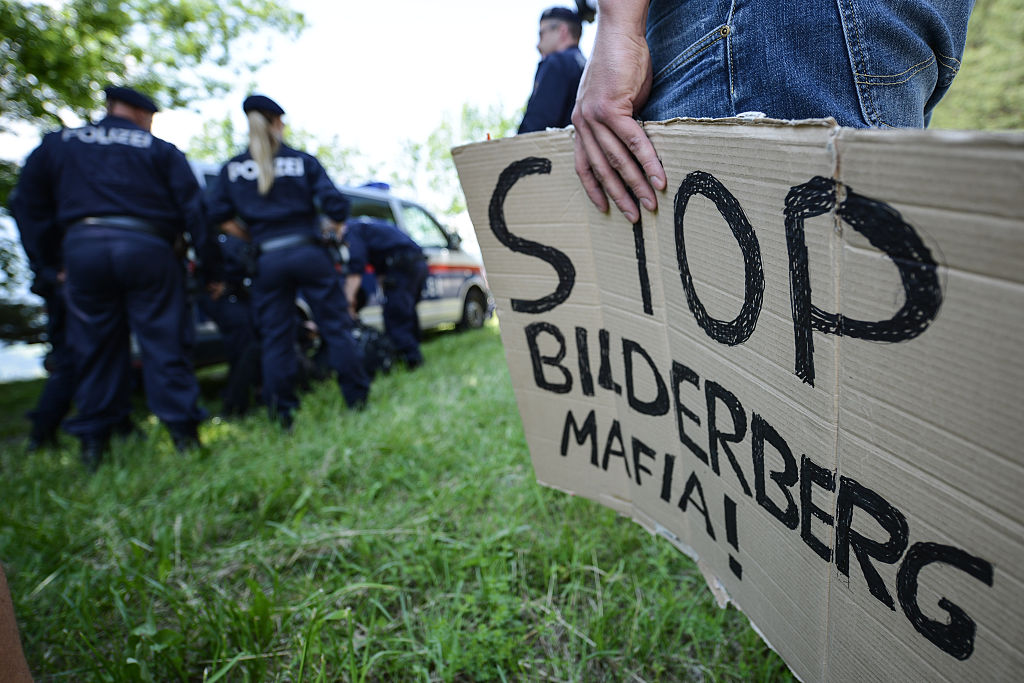 A protester holding a sign reading „Stop Bilderberg Mafia!“ looks on as Austrian police detain a fellow demonstrator near a checkpoint on a road leading to the the Interalpen-Hotel Tirol, venue of the Bilderberg conference, on June 11, 2015 near Telfs, Austria. Bilderberg members, who include CEOs of major corporations, high-ranking politicians, royalty, media and other influential individuals, are meeting at the hotel from June 11-14. The Bilderberg group is known for its secrecy.