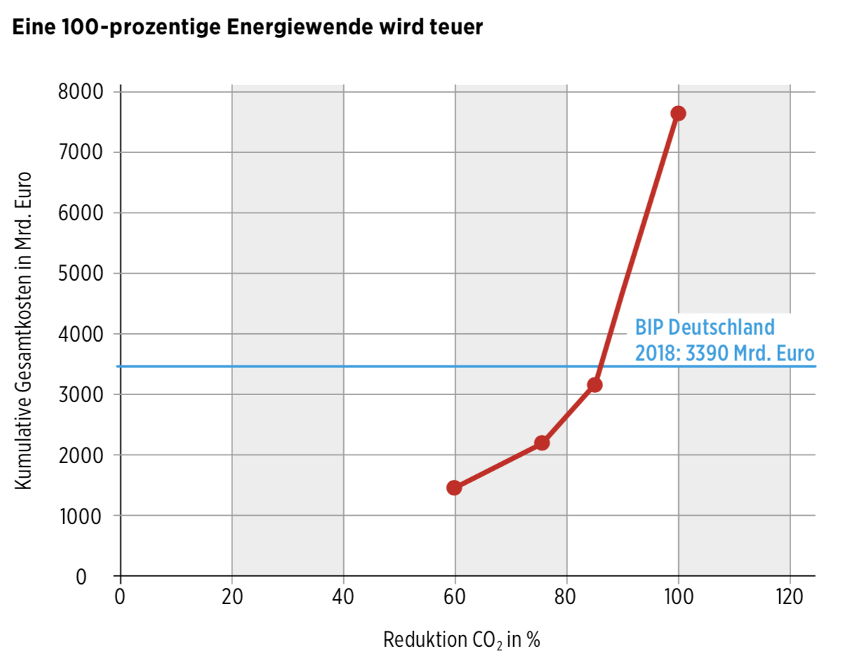 Als Referenzwert ist eine 40-prozentige CO2-Minderung bis 2030 angenommen worden. Die bis dahin entstehenden Kosten berechnen die Forscher mit 1.500 Milliarden Euro. Mutig nehmen sie an, dass sich die Kosten bis zu einer Minderung um 60 Prozent nicht wesentlich ändern. Die Autoren des Berichts beschreiben dann allerdings die nächsten Stufen wie folgt: „Es wird deutlich, dass sich die Kosten für das Energiesystem als Ganzes mit steigenden Reduktionszielen bei sonst gleichen Randbedingungen stark erhöhen. Diese Zunahme wächst stärker als proportional mit dem Minderungsziel: Eine zusätzliche Minderung um 15 Prozentpunkte (von 60 auf 75 Prozent) führt zu höheren systemischen Gesamtkosten von rund 800 Milliarden Euro, während eine weitere Minderung um zehn Prozentpunkte (von 75 auf 85 Prozent) fast 1000 Milliarden Euro Mehrkosten verursacht und eine nochmalige Minderung um weitere fünf Prozentpunkte (von 85 auf 90 Prozent) weitere rund 1300 Milliarden Euro.“