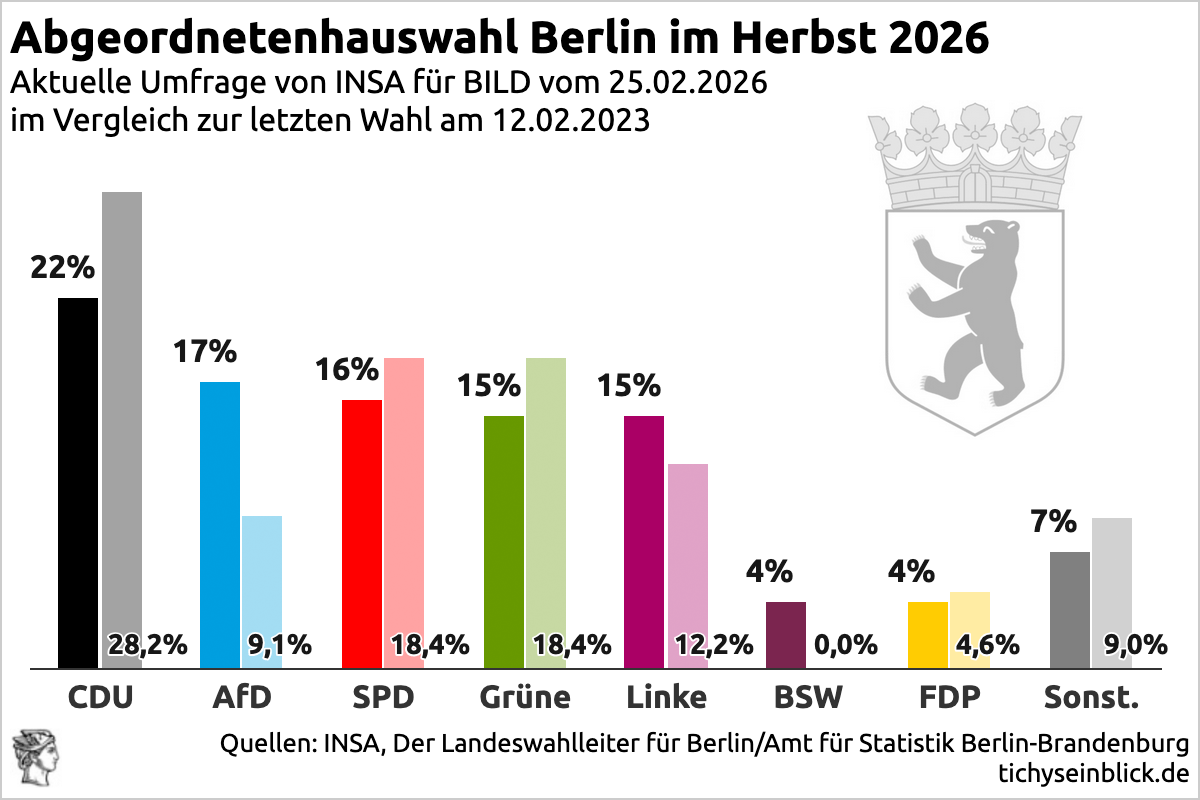 Verdoppelt sich die AfD nahezu in Sozialismus-4.0-Berlin, schrillen im Roten Rathaus wie im schwarzroten Kanzleramt die Alarmglocken. Ein demoskopischer Zuwachs von fast acht Prozentpunkten der AfD bedeutet keine plötzlichen neuen Anhänger, sondern noch mehr Bürger, die Rotschwarzgrün nicht haben wollen. (Die CDU 6,2 Punkte, die SPD 2,4 Punkte, die Grünen 3,4 Punkte runter und SED-Die Linke 2,8 Punkte rauf sind folgenlose rotschwarzgrünrote Binnenwanderungen.)