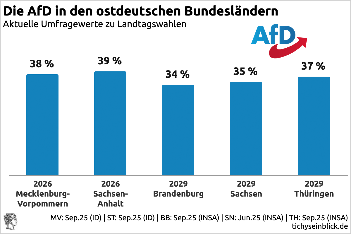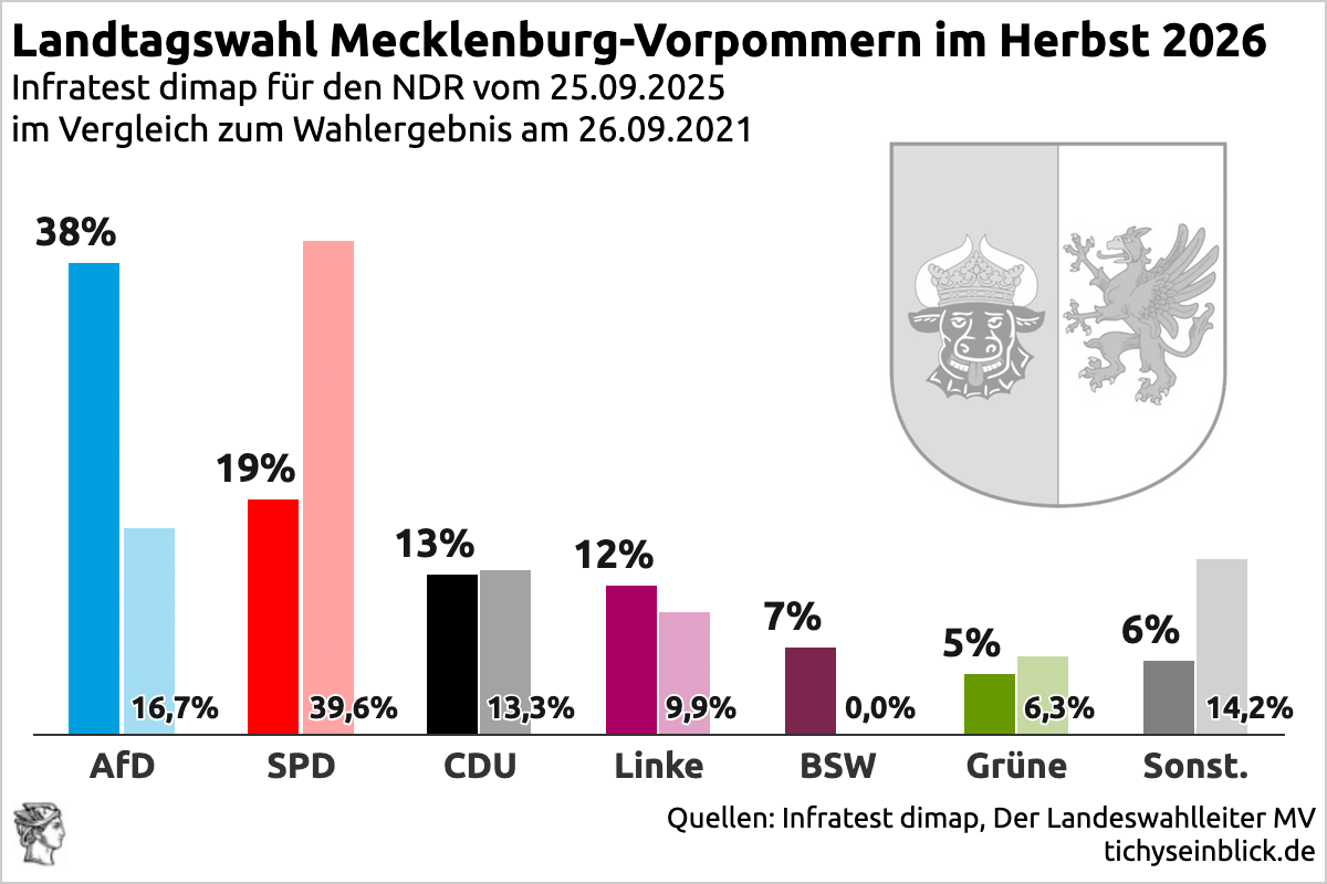 Aktuelle Umfragen erschüttern den Parteienstaat. Selbst das Institut Allensbach sieht die AfD inzwischen auf einem historischen Hoch. Zuvor hatten andere Institute Rekordwerte gemeldet. In Mecklenburg-Vorpommern käme die AfD aktuell laut Infratest dimap für den NDR auf 38 Prozent – mehr als doppelt so viel wie bei der Landtagswahl 2021. Sie tauschte fast Platz mit der SPD, die mit Ministerpräsidentin Manuela Schwesig nur noch 19 Prozent erreichte. CDU und SED-Die Linke lägen gleichauf mit 13 und 12 Prozent. Das BSW mit sieben Demoskopieprozenten zöge in den Landtag ein, die Grünen mit fünf müssten zittern.