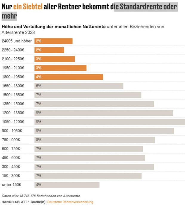 Tatsächlich erhält nur ein Siebtel der Deutschen die Standardrente oder mehr – das geht aus einer Erhebung des Handelsblatts hervor. Die gesetzliche Durchschnittsrente (Stand 2023) liegt hingegen bei nur 1.102 Euro und damit fast 700 Euro unter der Bruttostandardrente.