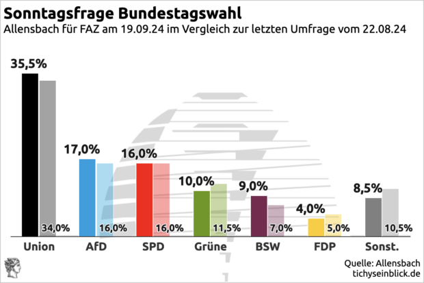 Sonntagsfrage: Union 35,5 Prozent, AfD 17, SPD 16 Prozent. Die Grünen fallen auf 10 Prozent, das BSW notiert bei 9 Prozent. FDP und Linke kämen nicht mehr in den Bundestag. – Allensbach fragt nicht telefonisch oder online, sondern face to face persönlich. Das erhöht einerseits die Qualität der Antworten, hebt aber auch die Scheu, bei Fragen die Wahrheit zu sagen, bei denen „politisch korrekt“ und von den Medien propagiert anderes erwartet wird.