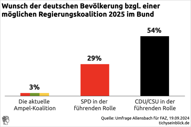 Nach einer Allensbach-Umfrage für die FAZ halten drei Prozent die Ampel gut für das Land. 54 Prozent möchten die CDU/CSU in einer führenden Rolle in der nächsten Regierung sehen, 29 Prozent die SPD. Schwarz-Rot nennen 29 Prozent als Wunschkoalition.