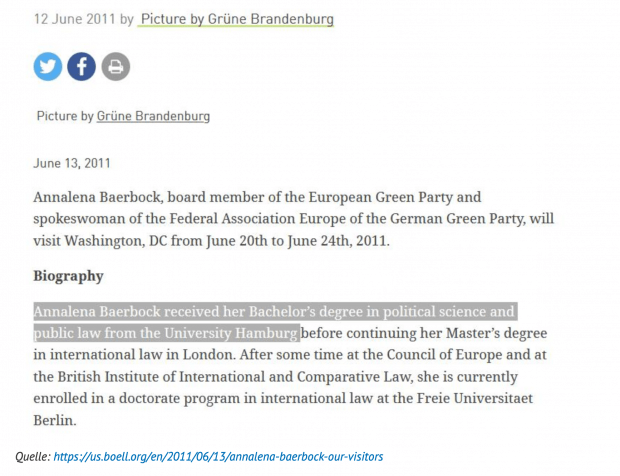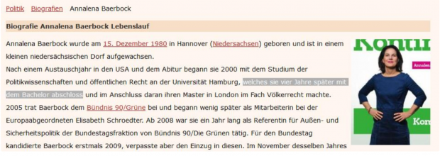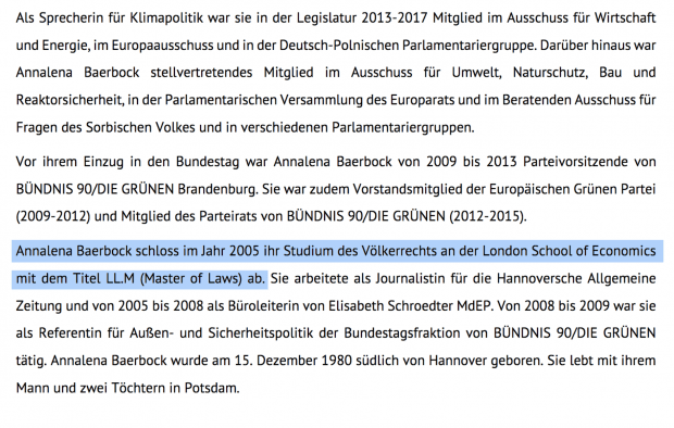 Auf ihrer Bundestagsseite erwähnte sie ihr Studium in Hamburg überhaupt nicht, sondern nur den Aufenthalt in London. Dort stand noch bis vor kurzem: „Annalena Baerbock schloss im Jahr 2005 ihr Studium des Völkerrechts an der London School of Economics mit dem Titel LLM (Master of Laws) ab.“