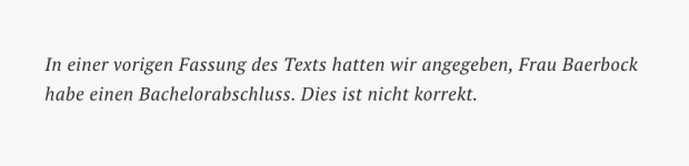 Der Tagesspiegel sekundierte mit einem larmoyanten Text über „Rechte Medien“, die nachgefragt hätten – und beschwerte sich über „Falschmeldungen“. Bisher kursierten allerdings weniger Falschmeldungen, sondern die Fragen mehrerer Medien, unter anderem von Hadmut Danisch, Tichys Einblick und Publico. Was die falschen oder zumindest irreführenden Behauptungen über die akademischen Meriten der grünen Kanzlerkandidatin angeht: Die stammen nachweislich und nahezu vollständig von ihrer Partei selbst.