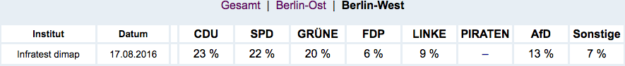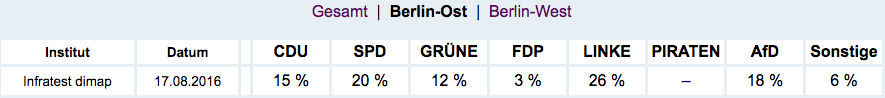 Im Ostteil der Stadt könnte die AfD Nummer 2 nach der Linkspartei werden. Für die Fortsetzung der Groko wird es nicht reichen, sondern nur für Rot-Rot-Grün. Das käme dann nahe an den Tagesspiegel hin. Im Ergebnis. Fast die „Nationale Front“. Bringt mich zu einem meiner Lieblingszitate: Die natürliche Entwicklung eines baufälligen Gebäudes ist sein Einsturz. Vorher noch eingezogene Stützpfeiler bewirken nur, dass der Krach am Ende plötzlich und groß ausfällt.