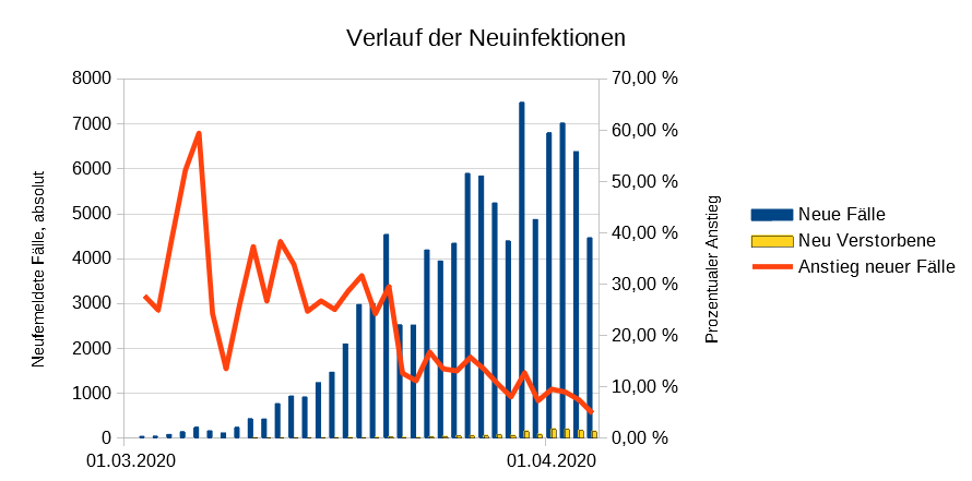 Vor allem seit dem 30. März gehen die Zahlen nach unten, also gut zwei Wochen nach Verhängung des Lockdown in Deutschland. Am 30. März lag der Zuwachs der Verstorbenenzahl zum Vortag noch bei 35 Prozent (ein Ausreißer nach oben), dann ging es auf 13,96 Prozent herunter, wieder auf 29 Prozent hinauf, seit dem 2. April aber deutlich abwärts: 21,78 Prozent, 15, 18 Prozent, 11,92 Prozent, 10,44 Prozent. Es handelt sich, wohlgemerkt, um täglich Zuwächse, die lediglich etwas geringer ausfallen. Aber die Entwicklung weist in die richtige Richtung: der steile Anstieg von März scheint gebrochen zu sein. Die Zuwächse bei den neu gemeldeten Infektionsfällen gingen noch deutlicher zurück: sie erreichten am 5. April mit Plus 4,61 Prozent einen vorläufigen Tiefststand. Allerdings hängt diese Zahl von den durchgeführten Tests ab, auch davon, welche Gruppen getestet werden. Aber auch ist der Trend eindeutig. Noch am 30. März lag der Tageszuwachs der neu Infizierten bei 12,73 Prozent.