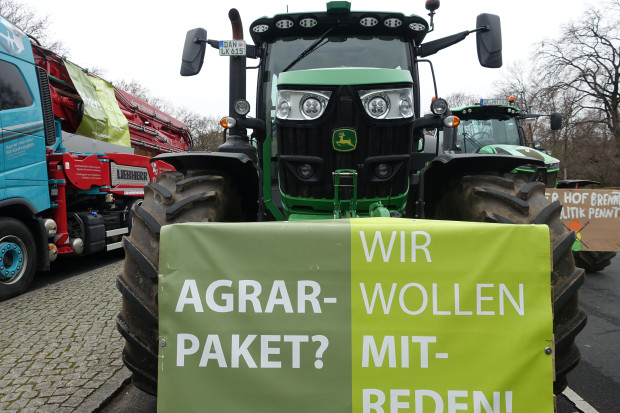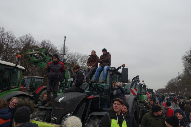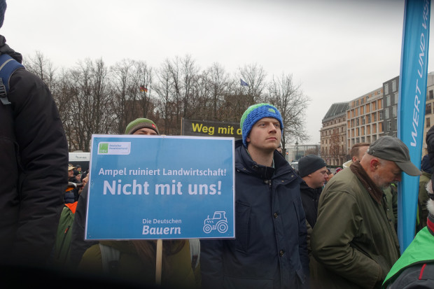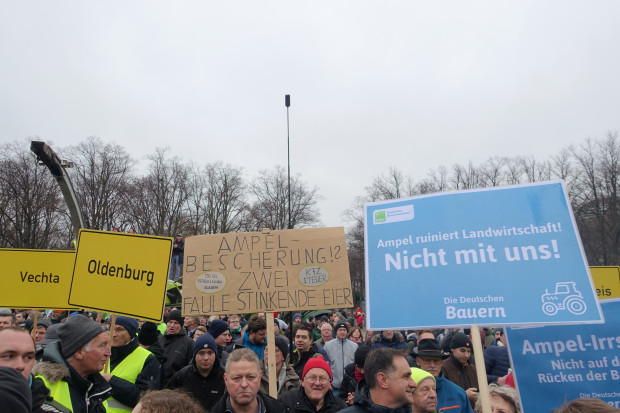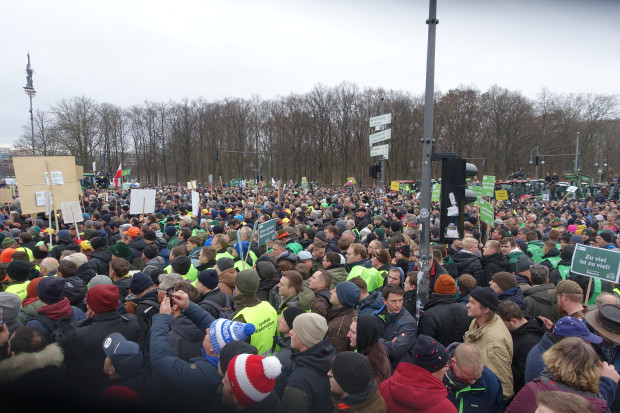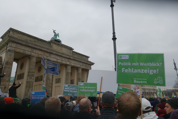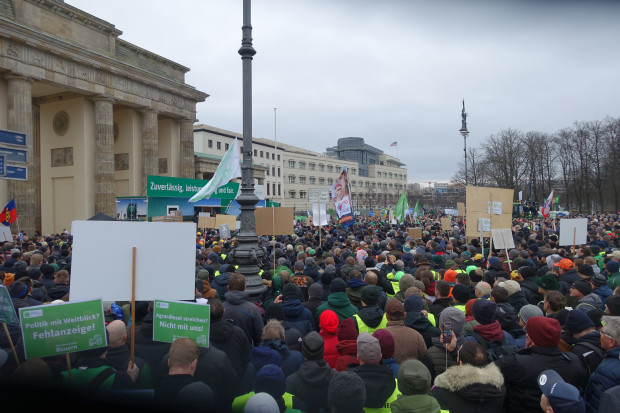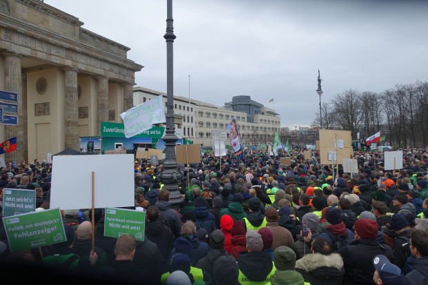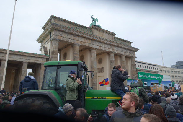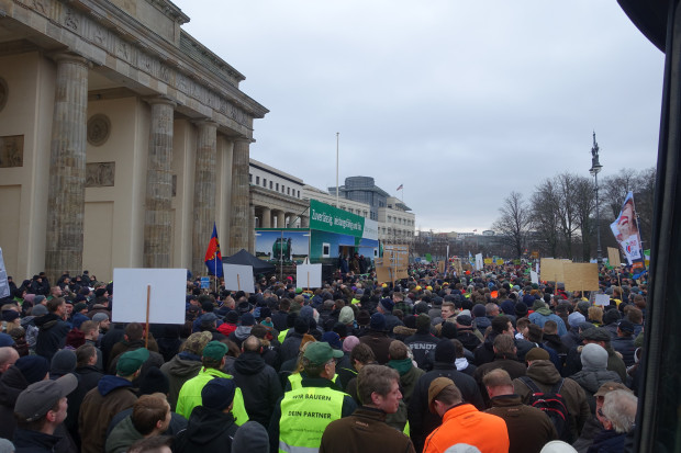 Der Platz des 18. März ist überfüllt. Mit so vielen Teilnehmern scheint der Deutsche Bauernverband nicht gerechnet zu haben. Die Wellenbrecher sind in einem zu engen Halbkreis um das Brandenburger Tor aufgestellt. So platzt die Kundgebung buchstäblich aus dem Rahmen, stehen die Teilnehmer bis zum Tiergarten. Auch die Tonanlage kann kaum mithalten. Zu groß ist der Krach, den die weit über tausend Demonstranten machen. Zu deutlich lassen sie ihre Wut raus über die Ampelkoalition, die deutsche Bauern nun mit der Besteuerung von Agrardiesel und landwirtschaftlichen Fahrzeugen belastet.