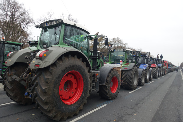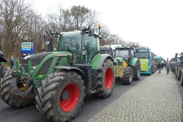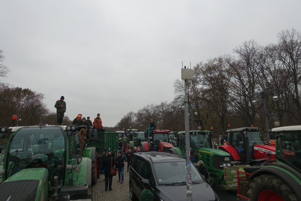 Dorthin sind die Traktoren unterwegs. Noch in der Nacht meldet der Verkehrsfunk von einer Art Sternfahrt, in der sie aus ganz Deutschland in die Hauptstadt unterwegs sind. Auf der Straße des 17. Juni sind Traktoren mit Nummernschildern aus Bayern zu sehen, aus Niedersachen, Sachsen-Anhalt – vom Brandenburger Tor bis zur Siegessäule reiht sich eine Maschine an die nächste.