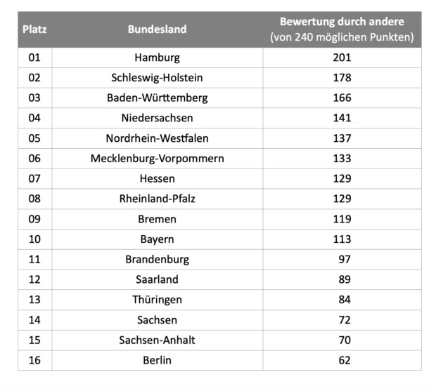 Die Berliner Zeitung „Der Tagesspiegel“ hat die Studienergebnisse exklusiv ausgewertet. Für das Ranking wurden die Rohdaten in ein Punktesystem wie beim „Eurovision Song Contest“ übersetzt, damit sie besser verständlich sind: Das bei einem Bundesland beliebteste andere Land erhielt 15 Punkte, das zweitbeliebteste 14 und so weiter.
