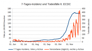 Die 7-Tages-Inzidenz fällt. Den Daten des Europäischen Zentrums für die Prävention und Kontrolle von Krankheiten (ECDC) erreichte die Inzidenz ihren bisherigen Höhepunkt von 159 Fällen am 15. November. Seitdem ist zum Sonntag auf 149 Fälle zurückgegangen. Das RKI meldete zum 15. November 143 Fälle pro hunderttausend und nun 139 Fälle. Gleichzeitig steigt die Zahl der täglich gemeldeten Todesfälle stark an. So starben in der vergangenen Woche täglich 300 Personen an bzw. mit Corona. Insgesamt wurden in der Woche zum 29. November 2.101 Todesfälle gemeldet.