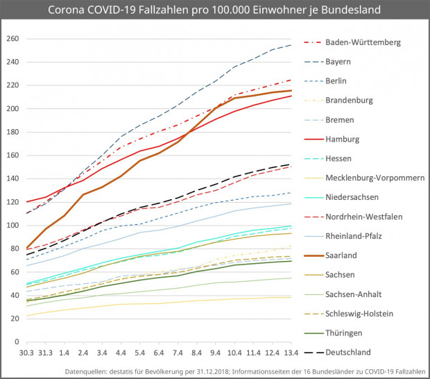 Laut Statistik sind nun 215,7 Personen pro hunderttausend Einwohner als infiziert gemeldet. Bayern führt die Statistik mit mittlerweile 254,8 Fällen/HT an, Mecklenburg-Vorpommern bildet mit 38,4 Fällen/HT weiterhin das Schlusslicht. Der deutschlandweite Durchschnitt beträgt 152,5 Fälle/HT.