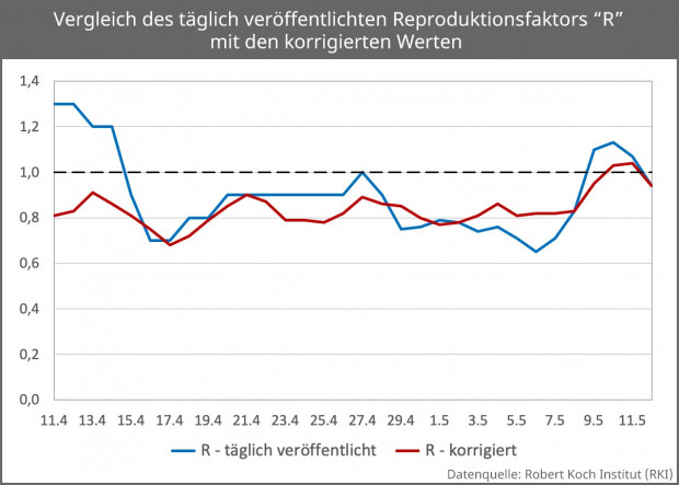 Das Redaktionsnetzwerk Deutschland titelte am 10. Mai: „RKI sieht Corona-Reproduktionsrate wieder über dem kritischen Wert 1“; um am 13. Mai zu titeln: „RKI-Reproduktionszahl fällt wieder unter kritischen Wert“.