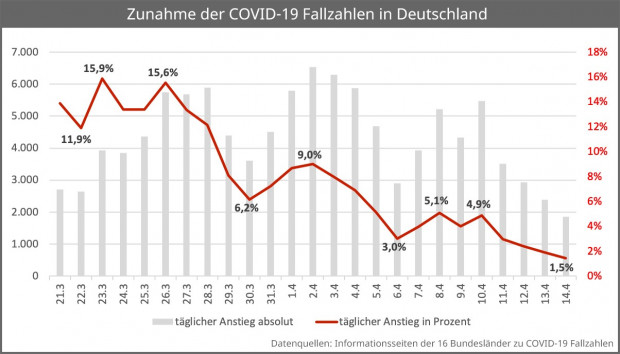 In Deutschland sind nun laut Länderinformationen 128.480 Personen als Corona-infiziert gemeldet (Stand 14. April, 20:00). Die Johns Hopkins Universität meldet 131.359 Fälle. Sie schätzt außerdem, dass davon 68.200 geheilt sind. Diese Zahl ist eine Schätzung, denn die Bundesländer melden nicht, wie viele Corona-Infizierte mittlerweile wieder genesen sind.