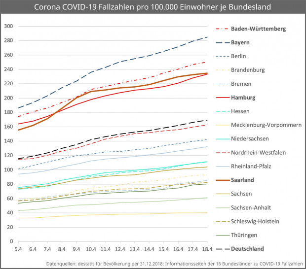 Im Saarland sind 2.327 Personen als infiziert gemeldet, davon werden 1.012 als genesen eingeschätzt (Stand 18. April, 18:00). Damit sind 234,8 Fälle/HT bekannt.