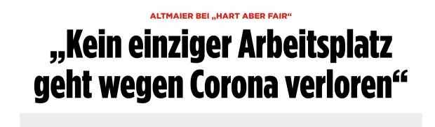 Einen weiteren Klassiker, beschrieb Alexander Wendt am 19. März: „Andere Behauptungen besitzen wirklich Gewicht. Auch eine große Reichweite. Etwa die Behauptung von Wirtschaftsminister Peter Altmaier: „Kein einziger Arbeitsplatz geht wegen Corona verloren.““