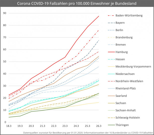 Es sind in Deutschland laut Länderinformationen mittlerweile 42.666 Personen als Corona-positiv gemeldet (Stand 26. März, 20:45). Die Johns Hopkins Universität meldet 43.646 Fälle für Deutschland (Stand 26. März, 22:15). Gestern waren noch 36.924 beziehungsweise 37.323 Fälle gemeldet. Damit steigt die gemeldete Fallzahl pro Hunderttausend auf 51,2, von gestern noch 44,3 / HT.