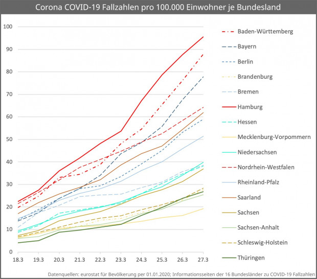 Im Vergleich der Bundesländer tut sich momentan wenig. Hamburg führt weiterhin die bevölkerungsrelative Fallzahlenstatistik an, auch wenn Baden-Württemberg aufzuschließen scheint.