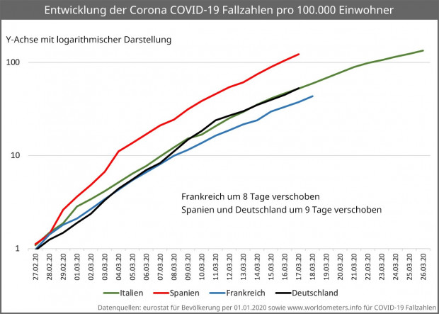 Laut Länderinformationen sind in Deutschland mittlerweile 48.354 Menschen als Corona-positiv gemeldet (Stand: 27. März, 20:30). Die Johns Hopkins Universität meldet 50.178 Fälle (Stand: 27. März, 22:30). Gestern wurden noch 42.666, beziehungsweise 43.646 Fälle gemeldet. 315 als Corona-positiv Gemeldete sind in Deutschland inzwischen verstorben. Das sind 0,65% der bekannten Fälle. Gestern waren es noch 0,6% beziehungsweise 258 Menschen, die gestorben waren. Seit mehreren Tagen schon steigt der Prozentsatz der Verstorbenen kontinuierlich an: um circa 0,05 Prozentpunkte je Tag.