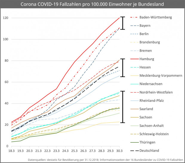 Im Ländervergleich konnte Bayern im Vergleich der  schlimmsten Zahlen beinahe mit Baden-Württemberg aufschließen. Dort sind nun 110,4 beziehungsweise 110,7 Menschen pro Hunderttausend als infiziert gemeldet. Hamburg fürt die Statistik weiterhin mit 120,2 Fällen an, Mecklenburg Vorpommern bildet mit 22,7 Fällen / HT das Schlusslicht.