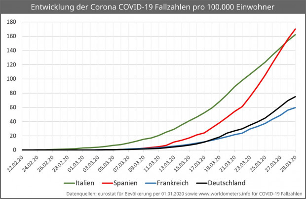 Im Vergleich der Fallzahlen pro hunderttausend Einwohner, überholte Spanien Italien am 28. März. In Spanien sind nun fast 170 Menschen pro Hunderttausend als Corona infiziert gemeldet. In Italien sind es gut 160 / HT. In Deutschland sind hingegen 74,7 Menschen / HT als infiziert gemeldet. Gestern waren es noch 70,4 Fälle / HT.