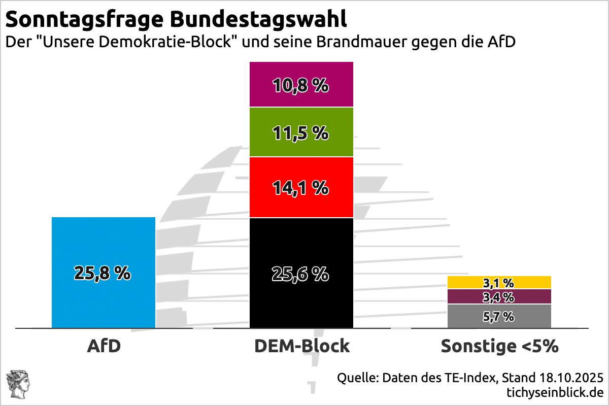 Wer ARD, ZDF, DLF plus etablierte Privatkanäle schaut und die Überschriften der Meinungs-verbundenen Printmedien konsumiert, bekommt unverändert die alte Welt präsentiert, in der Regierung und Opposition um die bessere Politik stritten und die Parteien an der Willensbildung des Volkes mitwirkten. Doch das ist zur puren Theorie geschrumpft. Die Wirklichkeit ist ein Parlament mit der einzigen Partei „Dem-Block“, da die AfD infolge der „Brandmauer“ nicht zählt.