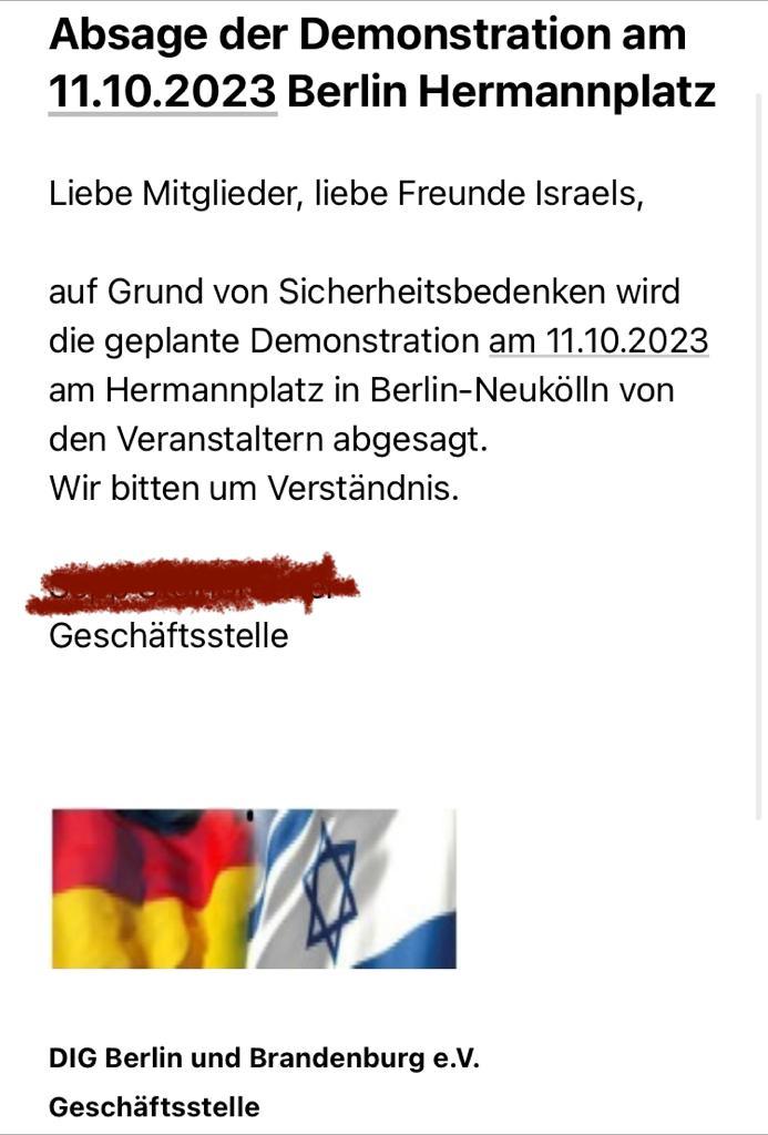Selbst die Sicherheit von Solidaritätsbekundungen für Israel kann oder will die Berliner Polizei offenbar nicht garantieren. Jedenfalls sagte die Deutsch-Israelische Gesellschaft Berlin-Brandenburg eine eigentlich für Mittwoch geplante Veranstaltung in Neukölln wegen Sicherheitsbedenken ab.