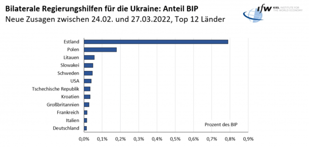 Im Verhältnis zur Wirtschaftsleistung ist Estland der größte Unterstützer der Ukraine gefolgt von Polen und Litauen. Die USA sind hier auf dem 6., Deutschland auf dem 12. Rang, wobei hier indirekt über die EU geleistete Hilfen nicht enthalten sind. „Die räumliche Nähe zu Russland oder der Ukraine spielt offensichtlich eine große Rolle für das Engagement einiger osteuropäischer Länder. Aber auch Großbritannien sticht sowohl absolut wie relativ zur Wirtschaftsleistung als Unterstützer der Ukraine hervor“, so Trebesch. Großbritannien und die USA haben auch jüngst die Lieferung von Haubitzen, Schützenpanzern und anderen schweren Waffen angekündigt. Diese sind in der Kieler Statistik noch nicht enthalten.