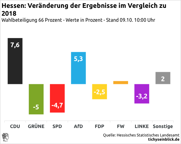 In Hessen hat die FDP genau 5,0 Prozentpunkte. So ein Zufall aber auch….. Darf ich davon ausgehen, dass es wieder eine Verliererkoalition (ausser CDU) gibt? Wir haben wieder die SPD, Grünen und/oder die FDP an der Backe. Was haben diese Wahlen schlussendlich gebracht? Nix! Es gibt auch auf Bundesebene keinerlei Konsequenzen. Das Ergebnis wird ignorier.t