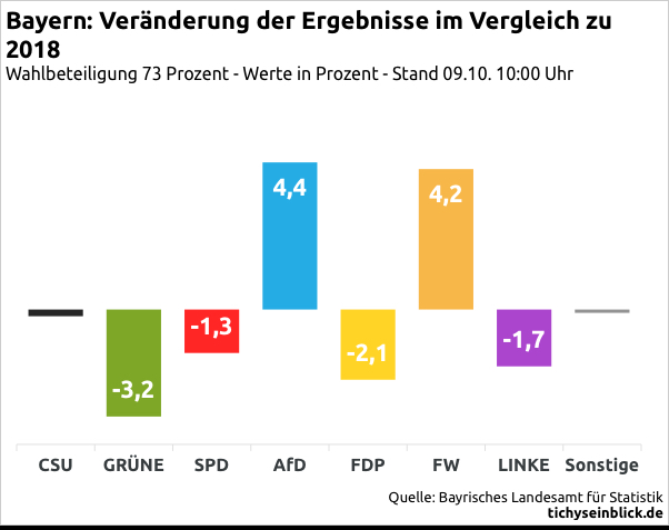 Die FDP hat keine Hoffnung mehr auf einen Einzug in den Landtag. Gewinner des Wahlabends sind die AfD und die Freien Wähler. Beide konnten ihr Ergebnis um mehr als vier Prozentpunkte steigern. Die Grünen sind die größten Verlierer des Abends. Aber auch Markus Söder verliert Stimmen: 0,2 Prozentpunkte. In einer Landtagswahl, die auch als Zwischenergebnis der Ampel gehandelt wird, kein souveränes Ergebnis für einen Vertreter der größten Oppositionspartei.