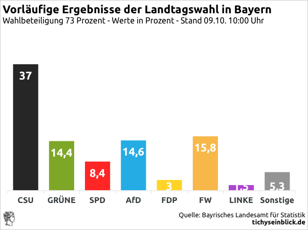 37% CSU, wo man zwischenzeitlich bei den Auszählungen und Hochrechnungen um 23:30 bei 36,4% lag, und somit der Stuhl von Söder gewackelt hat.