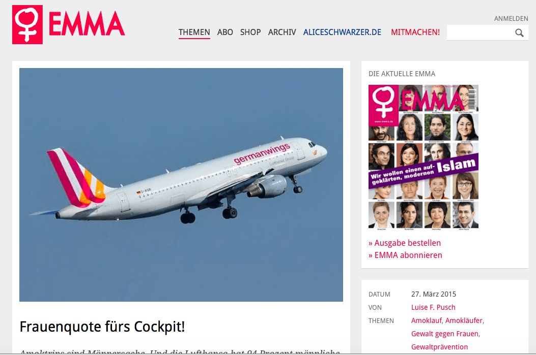 Flugkatastrophe: Innehalten ist das Gebot der Stunde – und Demut Published on 28. März 2015 in Flugkatastrophe: Innehalten ist das Gebot der Stunde – und DemutFull resolution (1053 × 699) Der garantiert dümmste Beitrag zur Katastrophe stammt von EMMA: Auf dem Feuerchen der Katastrophe wird das billigste politische Geschäftchen gekocht.