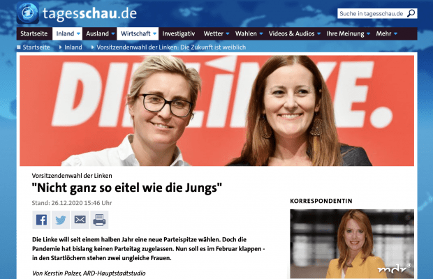Wie schaut es bei den Kollegen von der ARD aus? Dazu gehen wir in der Chronik (denn darum handelt es sich hier) einige Tage zurück, und zwar zu einem Vorbericht über den kommenden Parteitag der Linken auf tagesschau.de, geliefert am 26. Dezember 2020 von der MDR-Korrespondentin Kerstin Palzer.