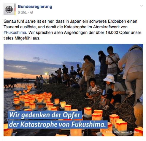 Er titelt unter Verwendung der von der Bundesregierung vorgegebenen Sprachregelung: „Gedenken an Fukushima-Opfer“.