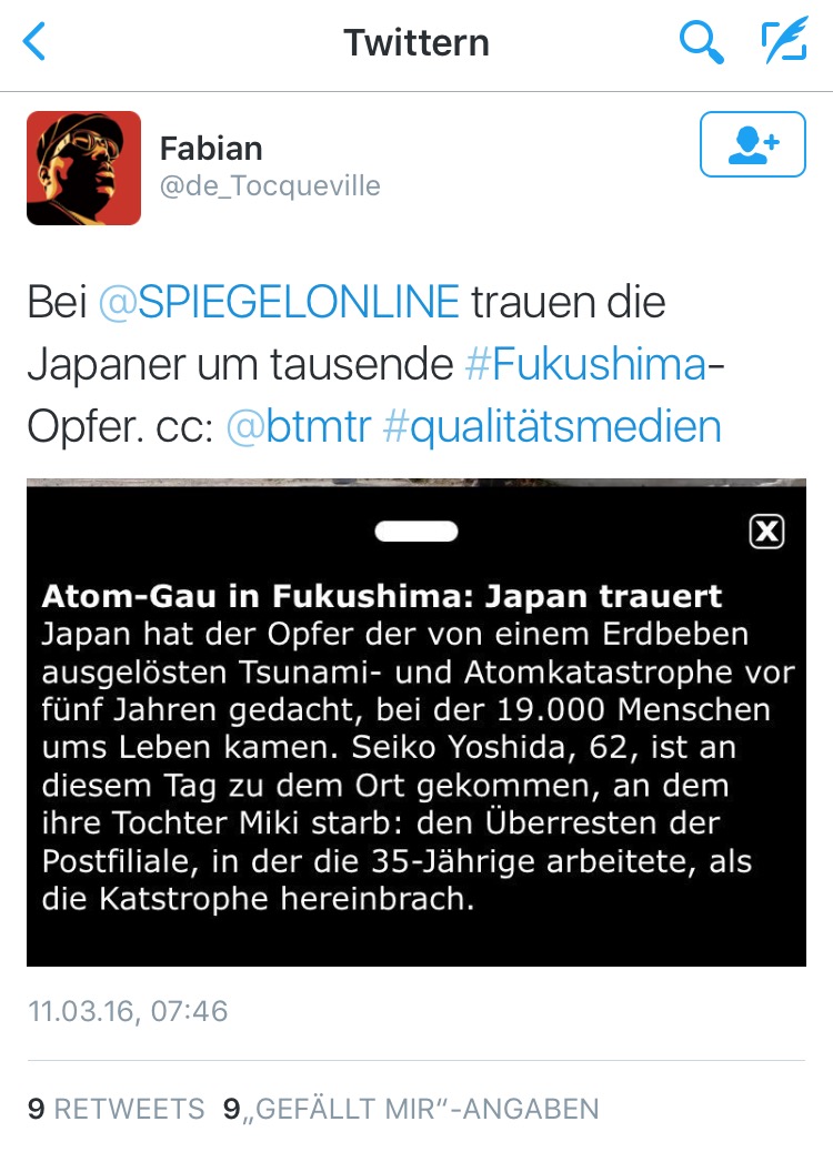 „Japan gedenke der Opfer der Atom-Katastrophe“. Aber genau das hat Japan nicht getan, einfach mangels zählbarer Opfer. Japan hat der Toten der Flutwelle gedacht. Die so entstehenden Bilder hat übrigens auch die Bundesregierung für ihre Agitation missbraucht.