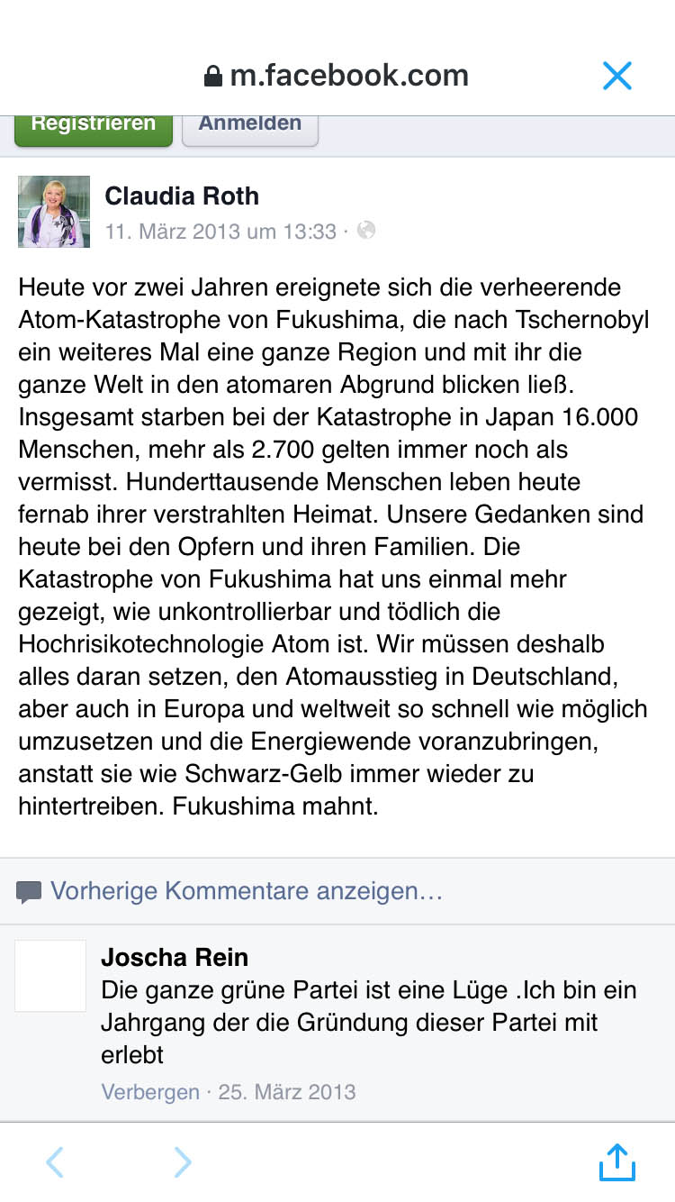 Das Bündnis 90/DIE GRÜNEN Rheinland-Pfalz auf Facebook zieht eine gerade Linie, an deren Beginn steht die Atom-Katastrophe von Tschernobyl und am Ende das AKW in Mülheim-Kärlich: Dass die Reaktoren in Japan abgeschaltet waren, interessiert keinen Menschen. Dass sich um die stillgelegten Kernreaktoren in Deutschland das Sicherheitsrisiko erhöht hat, weil statt einer Endlagerung die gefährlichen Brennstäbe kaum geschützt herumliegen und vor sich hinstrahlen – kein Wort darüber. Das wären ja Fakten, die eche Betroffenheit auslösen könnten und berechtigte Angst vor den Folgen einer emotional gesteuerten Politik.