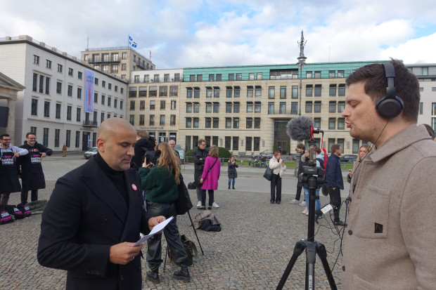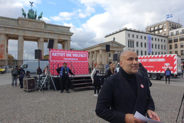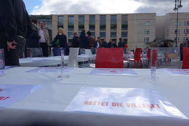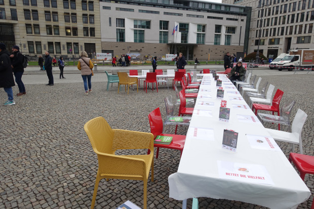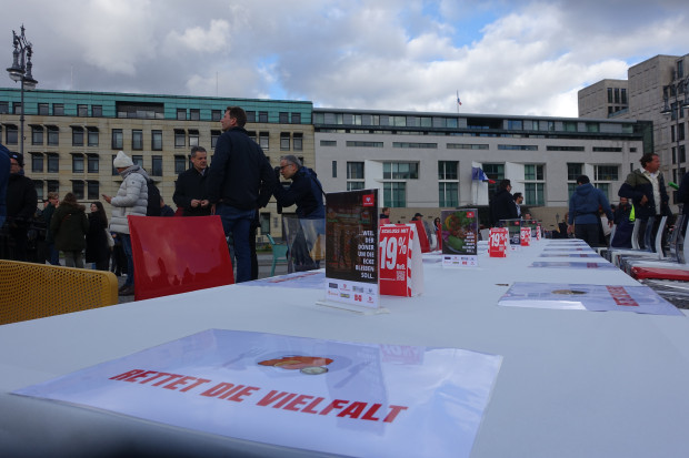Gedeckte Tische stehen auf dem Pariser Platz. Und Stühle. Die Stühle stehen leer. Das Bündnis „Rettet die Vielfalt!“ hat sie für eine Kundgebung aufgestellt. Sie sollen an das Szenario mahnen, das drohe, wenn die Ampel wie geplant zum Jahreswechsel die Mehrwertsteuer in der Gastronomie von 7 auf 19 Prozent erhöht. Dann werden es viele Betriebe nicht schaffen, sagt Kemal Üres, der in den sozialen Netzwerken als „der Gastroflüsterer“ bekannt ist. Denn die Wirte müssten die höhere Mehrwertsteuer eins zu eins an die Gäste weitergeben – und die seien schon jetzt kaum noch in der Lage, die hohen Preise zu zahlen.
