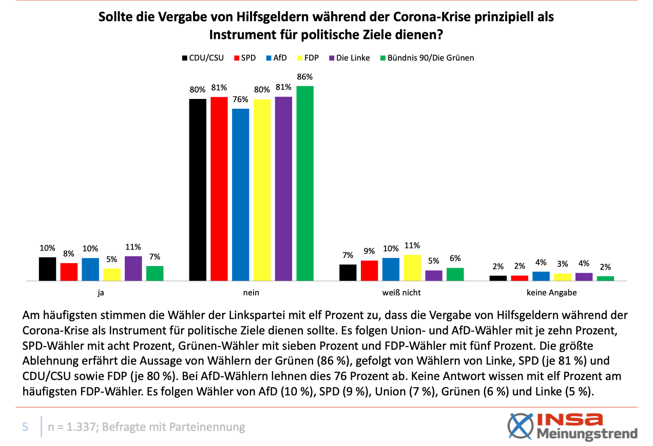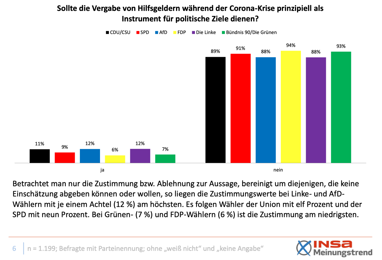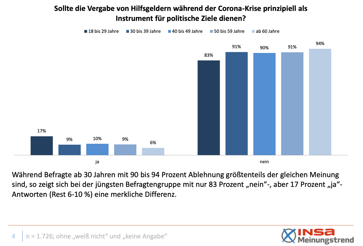 Solche Einmütigkeit über alle Parteigrenzen und Altersgruppen hinweg ist selten: Die Bürger lehnen jegliche politische Zielsetzung hinter der Vergabe von staatlichen Hilfsmitteln in der Coronakrise ab.