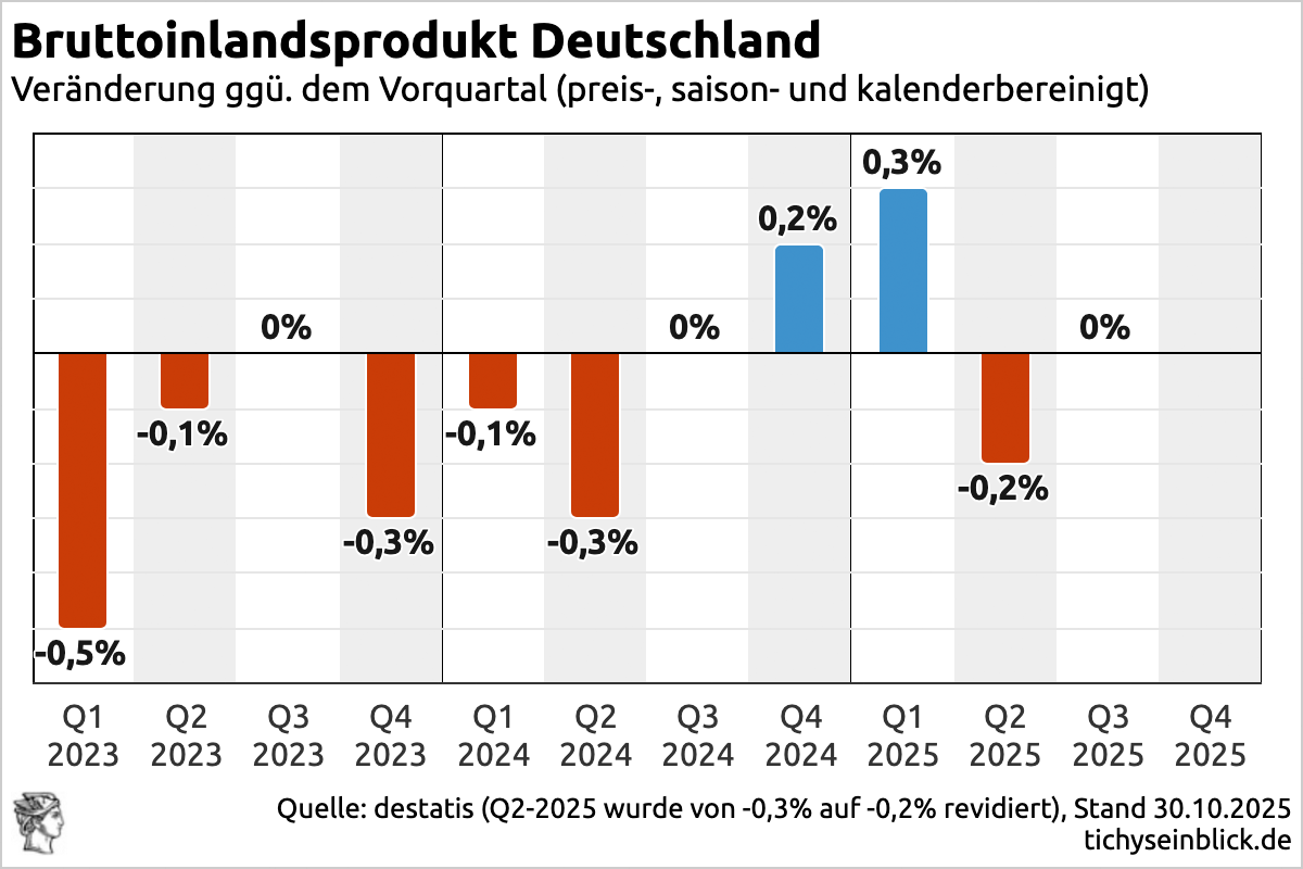 Bis zur katastrophalen Coronapolitik wuchs das BIP noch. Seit dem dritten Quartal 2019 tritt es auf der Stelle – seit sechs (!!!) Jahren. Das dritte Quartal von 2025 und 2019 gleichen sich.