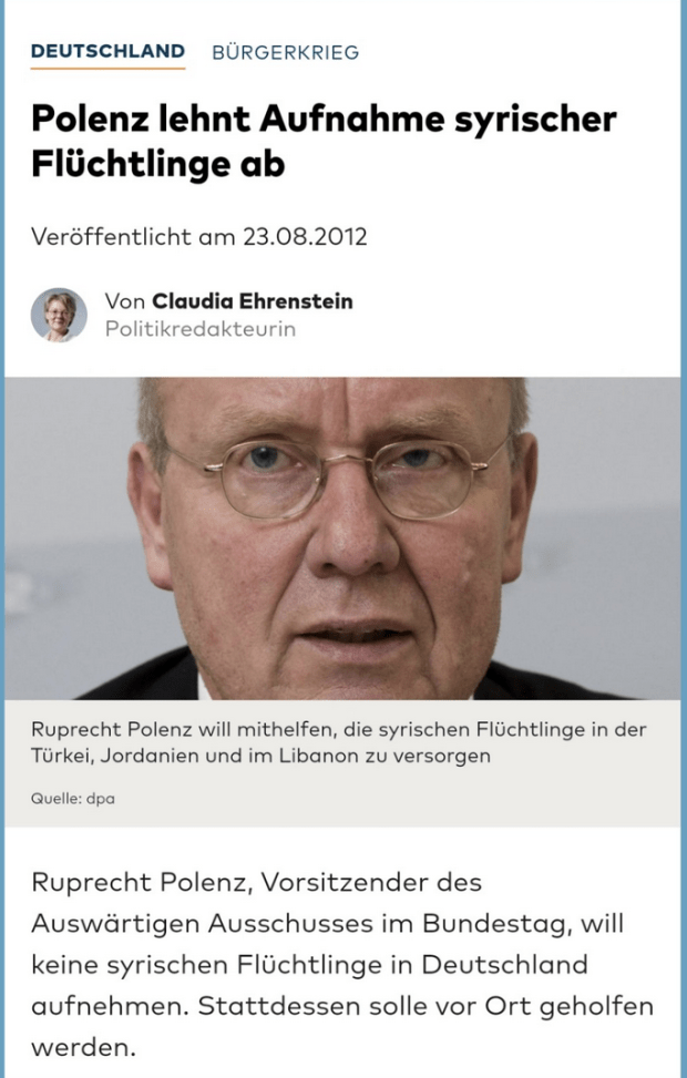 Neben Polenz’ Twitter-Märchenstunde gibt es noch einen zweiten und entscheidenden Punkt – und zwar im Archiv. Im Jahr 2012 sprach sich ein prominenter CDU-Politiker ausdrücklich gegen die Aufnahme von syrischen Bürgerkriegsflüchtlingen aus. Stattdessen, meinte er, sollten die Nachbarländer sie aufnehmen – und Deutschland ihnen dabei helfen. Der Name des CDU-Manns: Ruprecht Polenz.