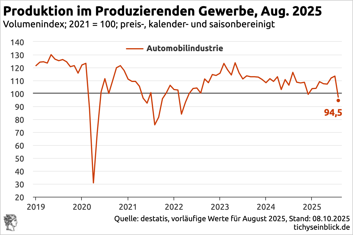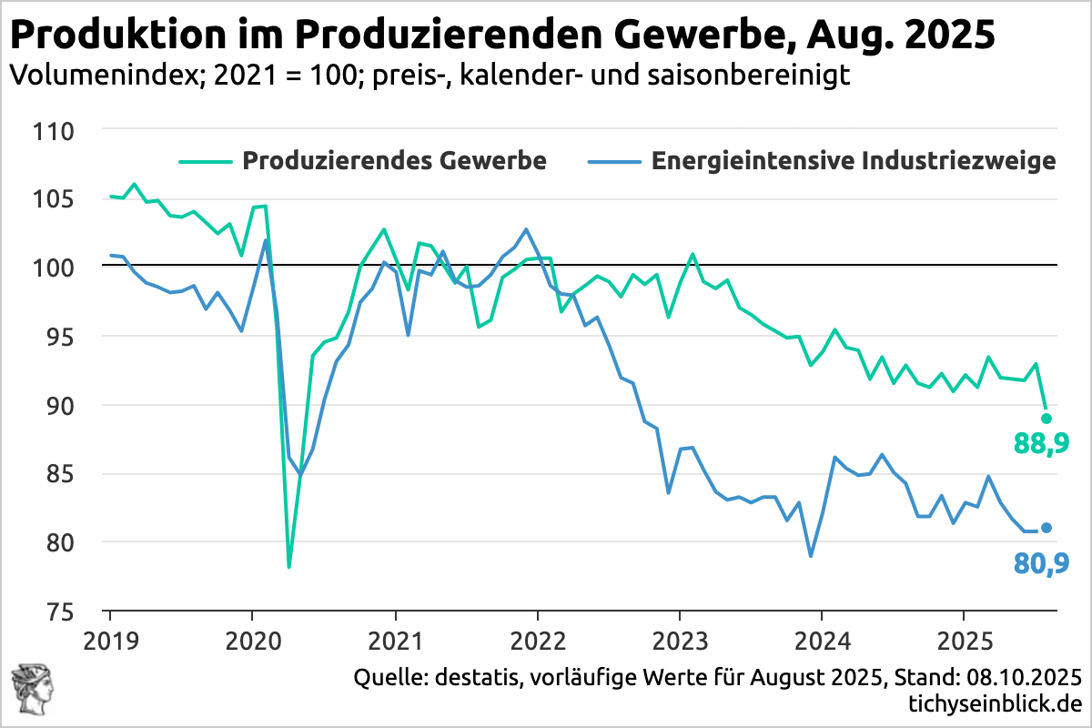 Ohne Erwirtschaften geht es nicht. Wo nicht erwirtschaftet werden darf, wird nur genommen – aber von wem soll das Genommene morgen kommen? Die reale (preisbereinigte) Produktion im Produzierenden Gewerbe ist nach vorläufigen Angaben des Statistischen Bundesamtes (Destatis) im August 2025 gegenüber Juli 2025 saison- und kalenderbereinigt um 4,3 % gesunken.