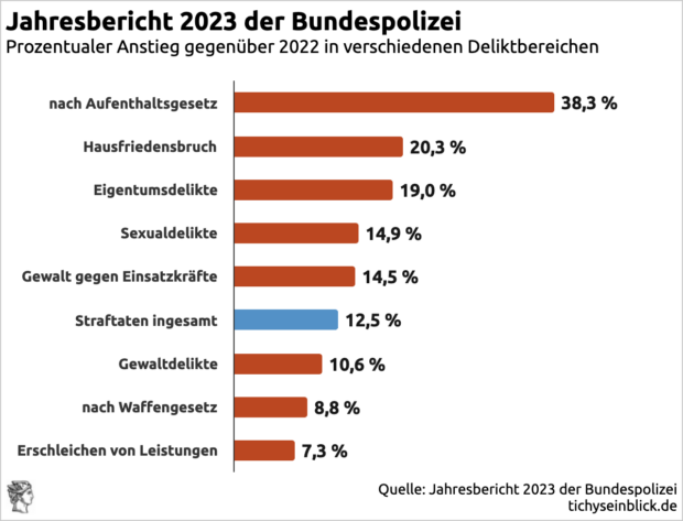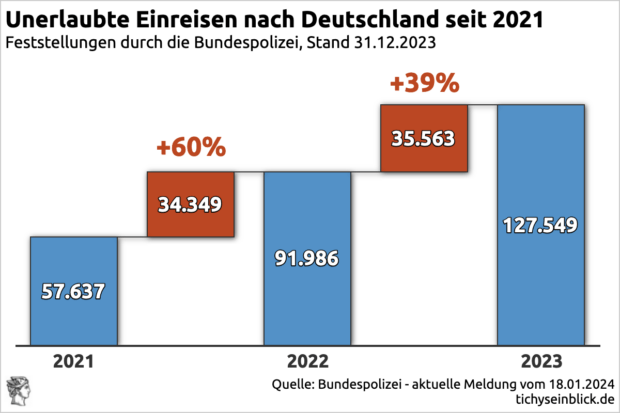 Deutlich gestiegen ist die Zahl der illegalen Einwanderung. Sie erreichte mit 127.549 im vergangenen Jahr den Höchststand seit 2016. Gegenüber 2022 stieg die Zahl um 39 Prozent. Die meisten Fälle (32.893) registrierten die Polizisten an der Landgrenze zu Polen, 28.099 zu Österreich, 18.539 zur Schweiz und 16.700 zu Tschechien. Auf dem Luftweg gab es knapp 14.000 registrierte illegale Einreisen.