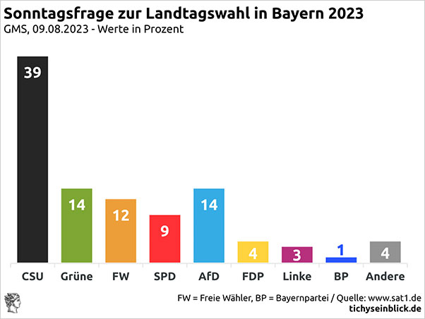 Im Schnitt der Umfragen des August liegt die CSU bei 38 Prozent, die AfD bei 14, die Grünen bei 14, die Freien Wähler bei 13, die SPD bei 10 und die FDP bei 4 Prozent.