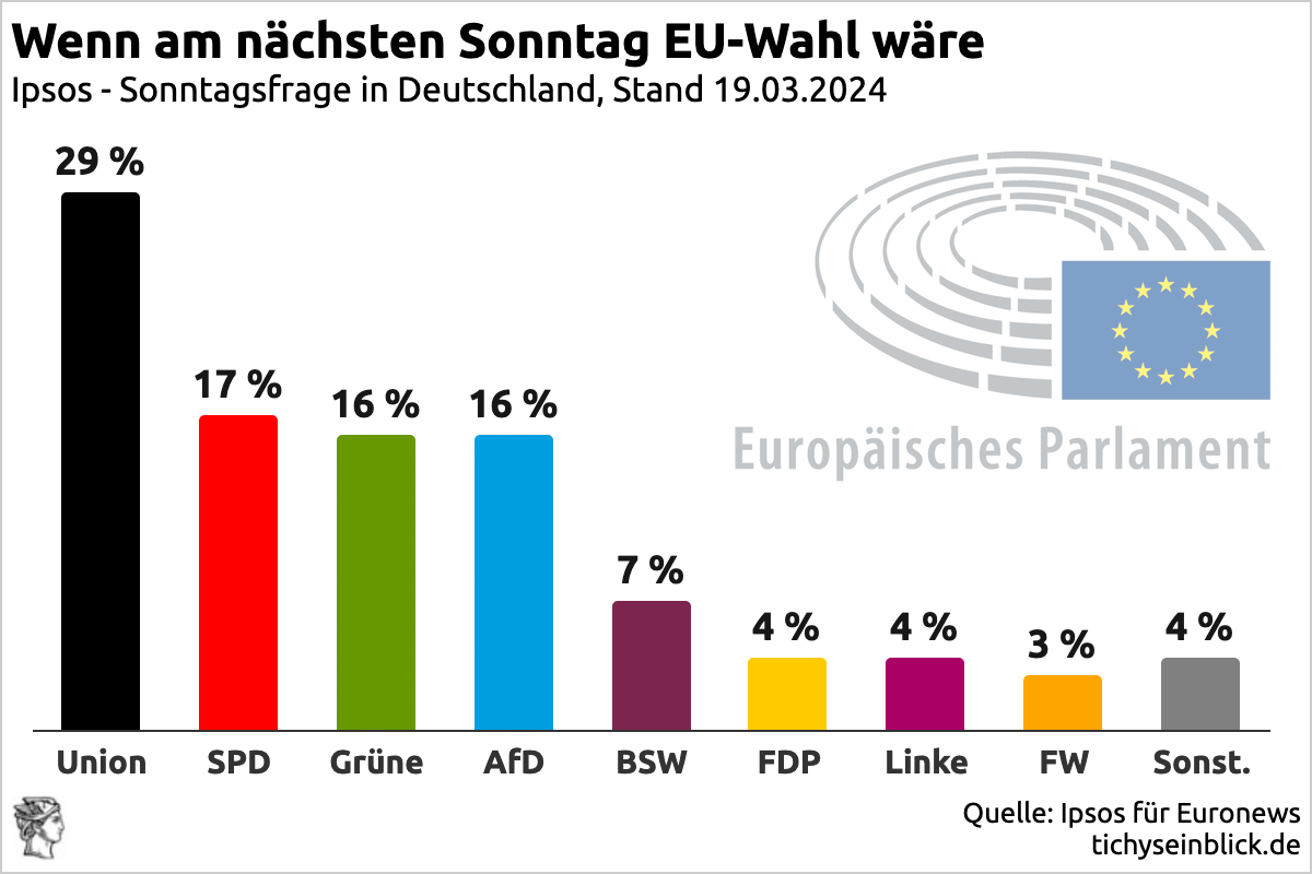 Nur 16% für die AfD bei den Europawahlen? Noch hinter der SPD und gerade mal so viel wie die Grünen, die sogar mehr bekommen als bei der Bundestagswahl 2021. Absolut unglaubwürdig. Ipsos kommt aus Frankreich und ist wohl ähnlich links wie forsa. Bei Insa vom 13.3.24 liegt die AfD bei 20%.
