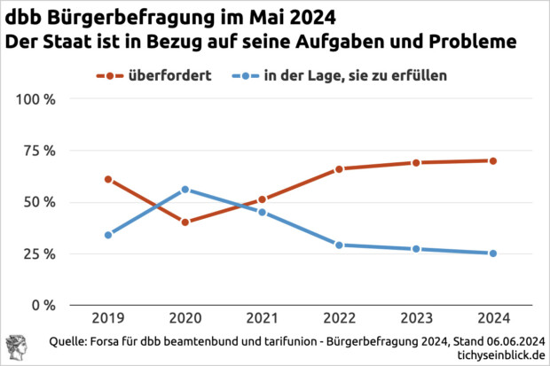 Dass 70 Prozent den Staat bei seiner Aufgabe der Problemlösung für überfordert halten, haben wir hier gestern aus den Ergebnissen der 18. Bürgerbefragung des Deutschen Beamtenbundes durch forsa wiedergegeben. Heute ein Blick darauf, welche Probleme dabei zentral sind. Und natürlich ist nicht „der Staat“ überfordert, sondern sind es die Berufspolitiker in den Regierungsämtern zusammen mit ihren Mitläufern in den Parlamenten und den Journalisten, die ihre Kontrollrolle gegen die Unterstützung der Herrschenden eingetauscht haben.